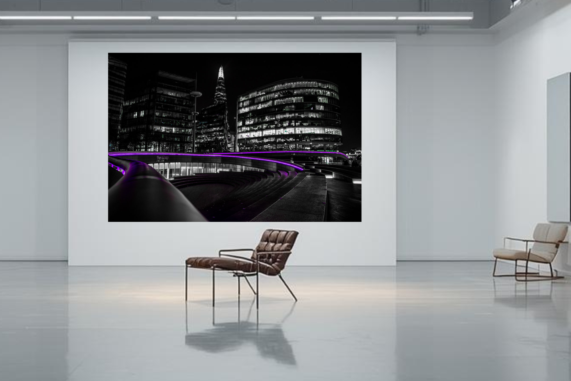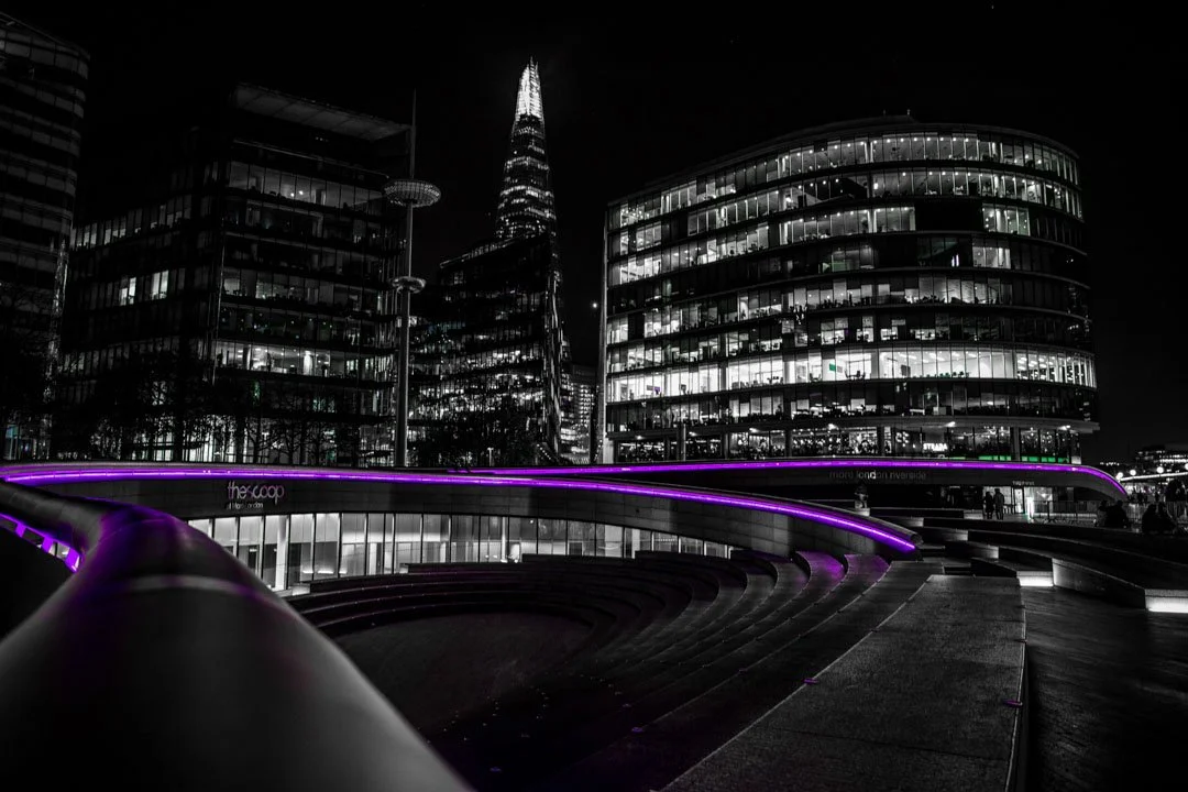 The architecture glows with clean lines and modern reflections. A streak of neon purple light pulses towards the shard. The mono cityscape allows the vibrant colour to dominate with futuristic energy.