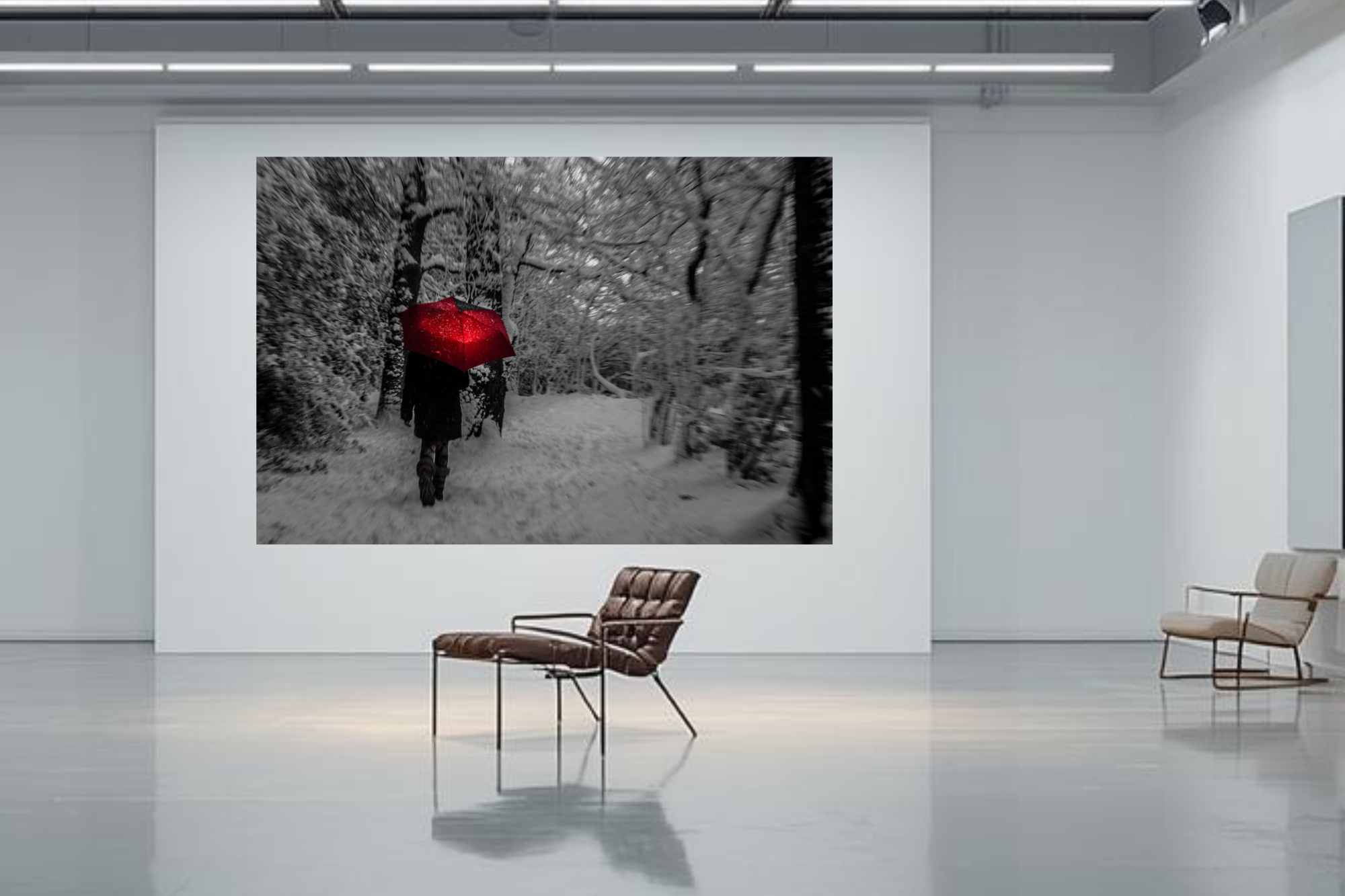 The cold monochrome landscape enhances the warmth of the umbrella, creating a striking contrast.