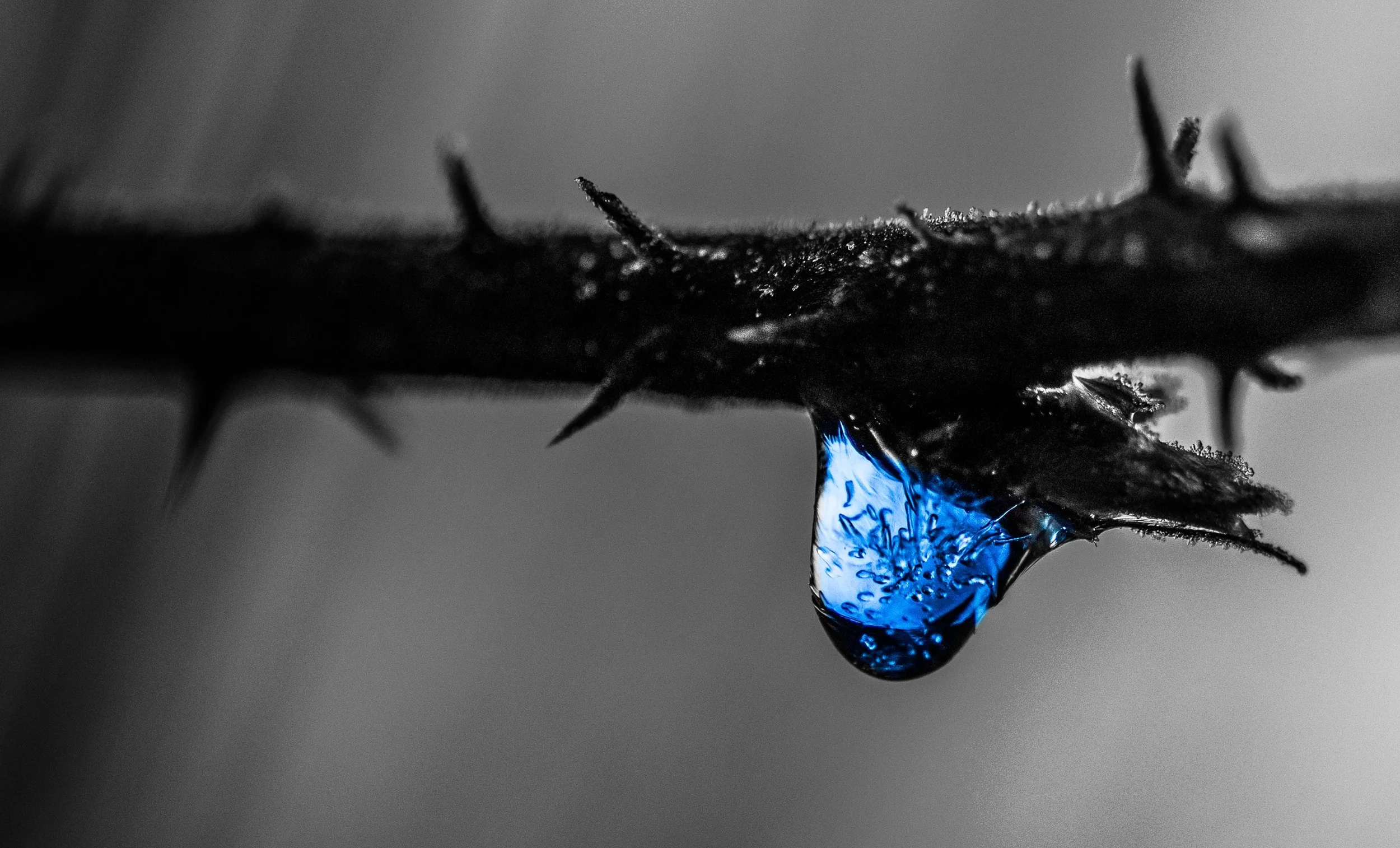 A single droplet clings to a thorn covered stem and its vivid blue core glows like frozen light as the monochrome background enhances the delicate and fragile presence. The close up detail transforms a tiny moment into something dramatic.