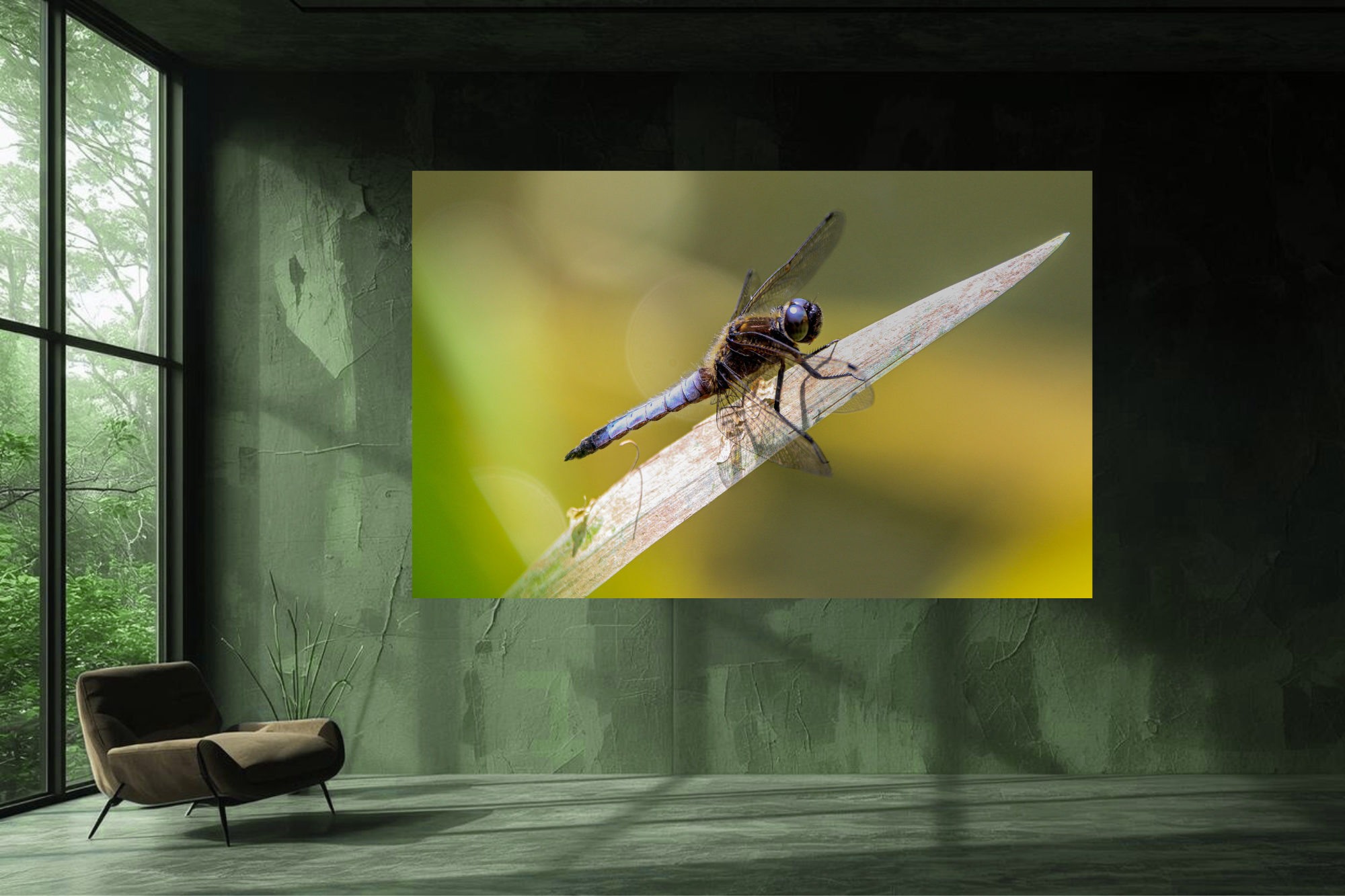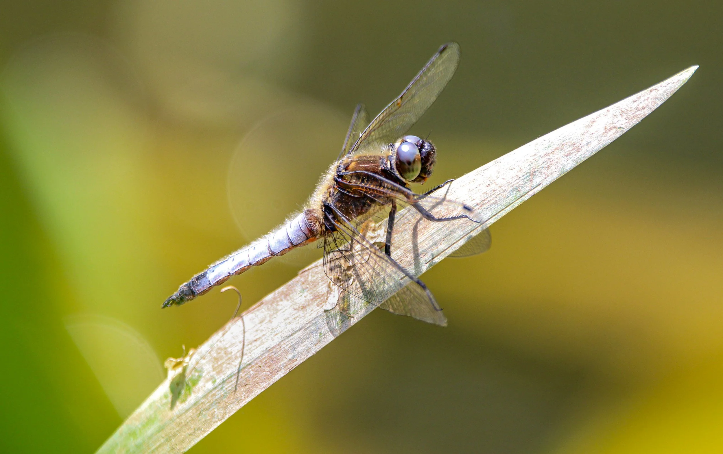 A dragonfly rests lightly on a single blade of grass, wings catching the light while the world behind dissolves into soft colour. Balanced and perfectly still, it feels less like a passing moment and more like a watchful pause in nature’s rhythm.