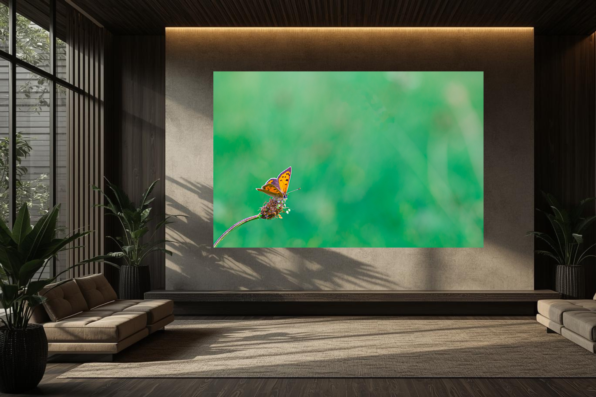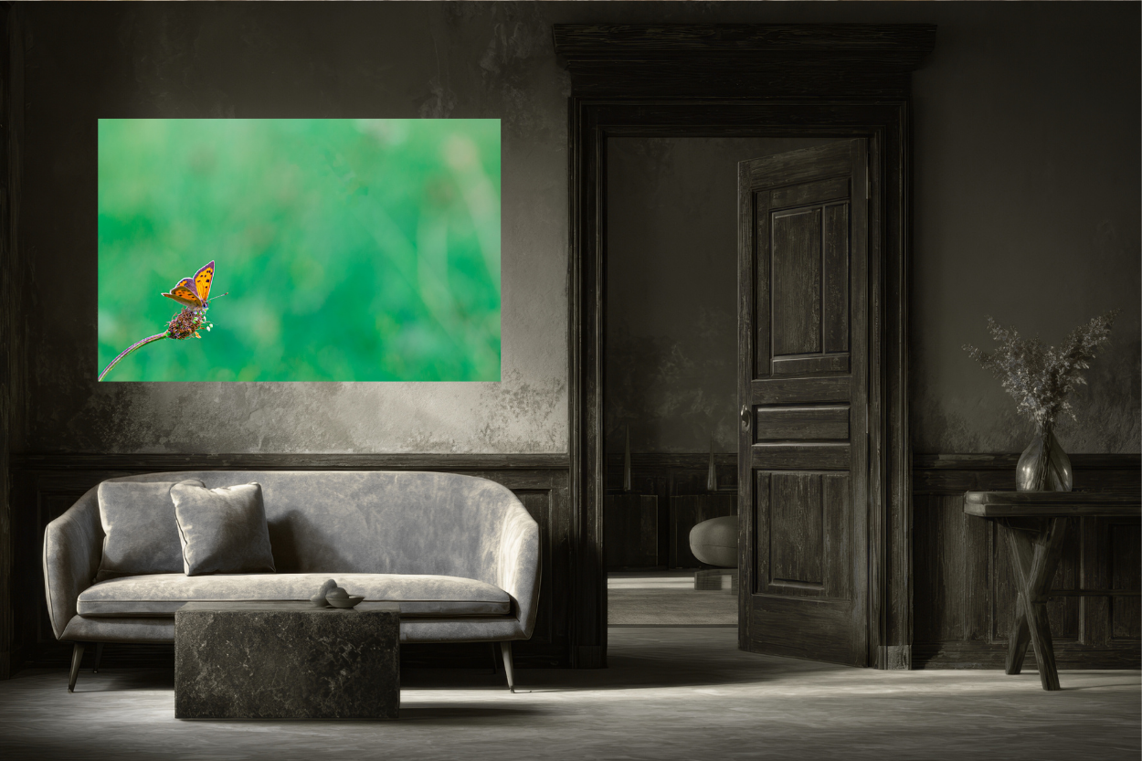 A Small Copper butterfly sits neatly on a flower stalk his vibrant colour contrasting beautifully against the soft green background, giving the delicate orange and brown wings full prominence. The placement creates a sense of balance and space.