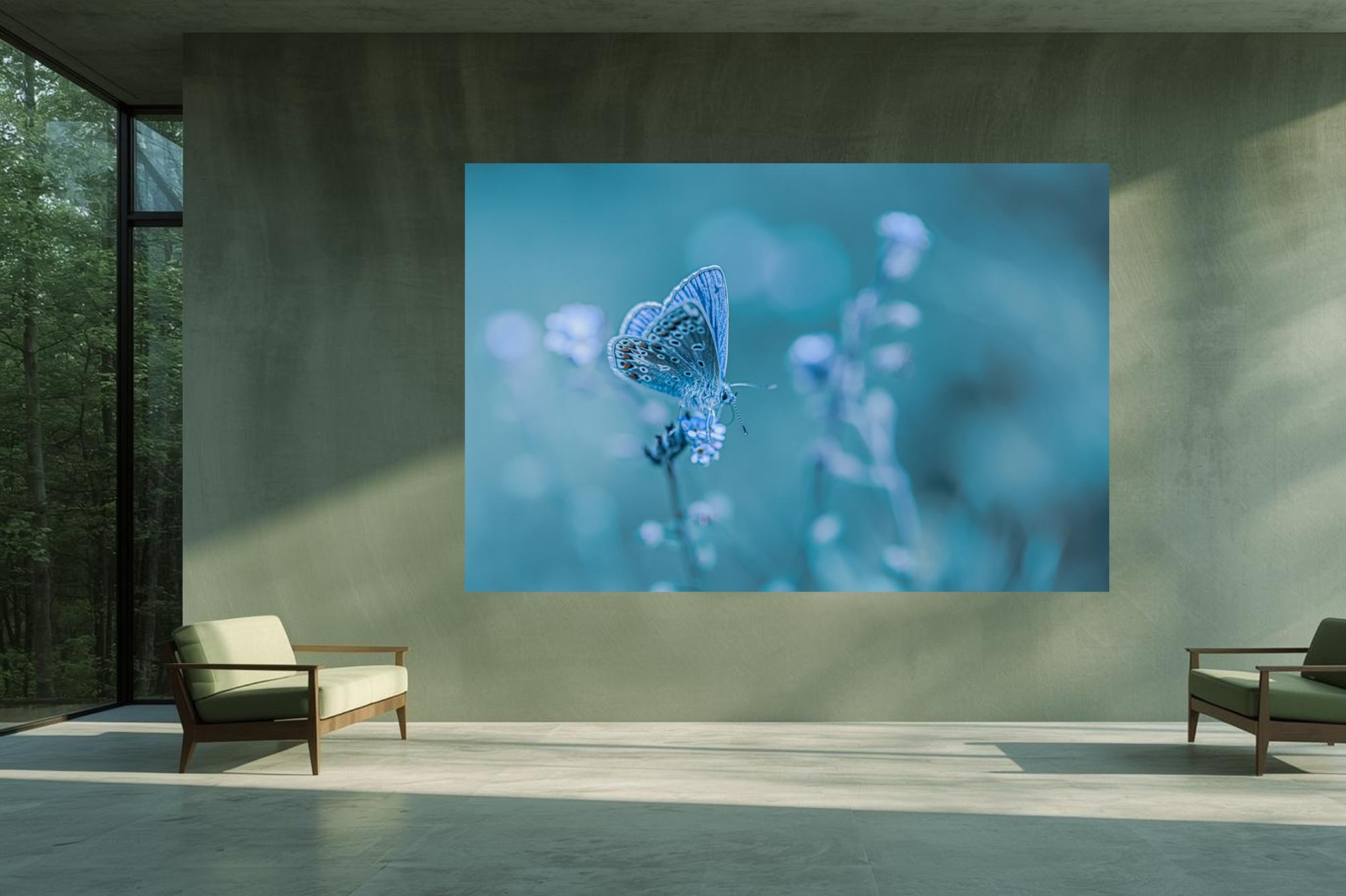 A Common Blue butterfly rests on a flower where every surface shares the same cool blue palette. The subtle variations in tone create a dreamlike cohesion that makes the butterfly feel like part of the air itself. The harmony of colour gives the scene a soothing and immersive quality.