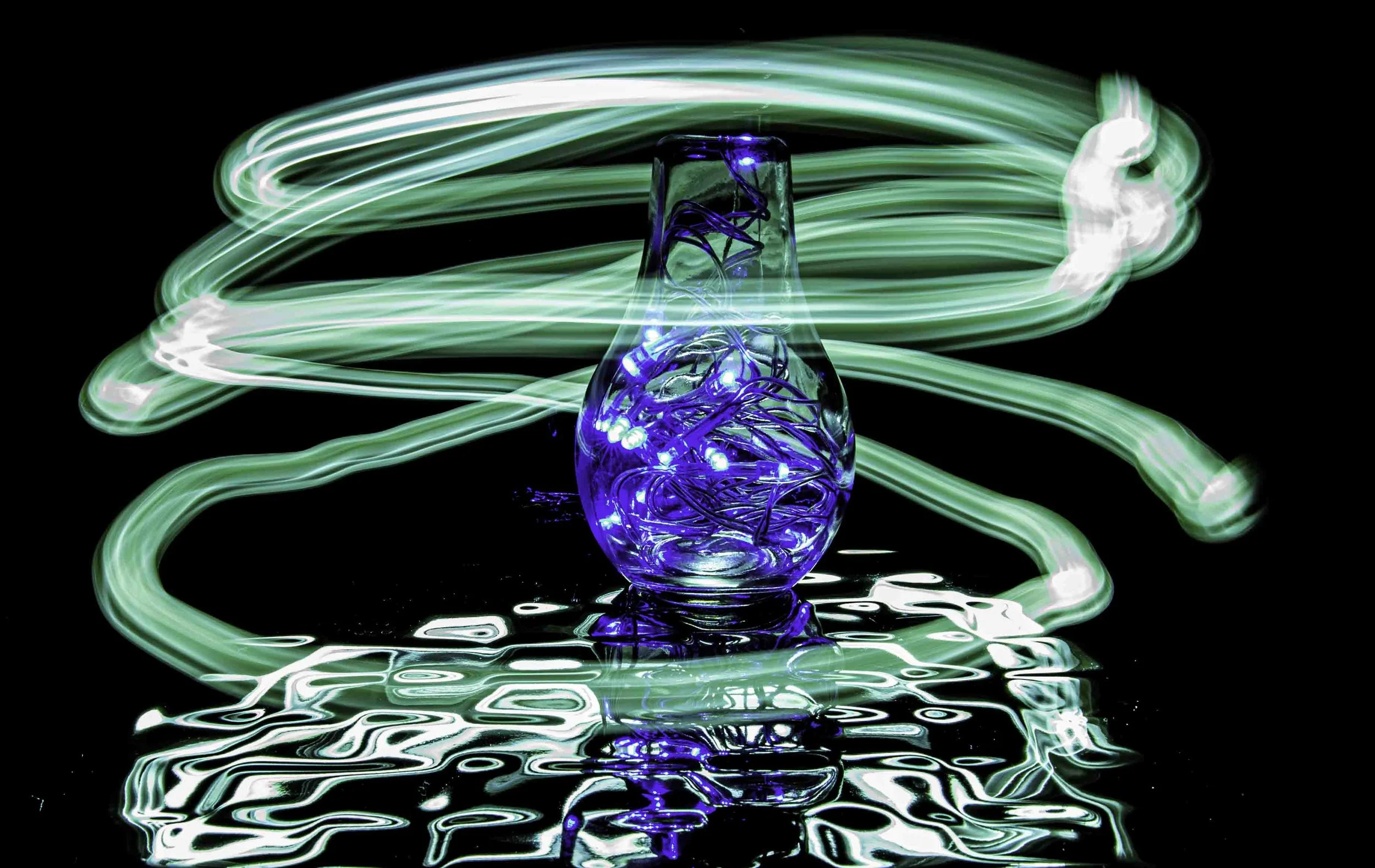 Swirls of light form around a bulb indicating a moment of clarity of thought...light illuminating the dark around and reflecting on the beautiful rippled surface.