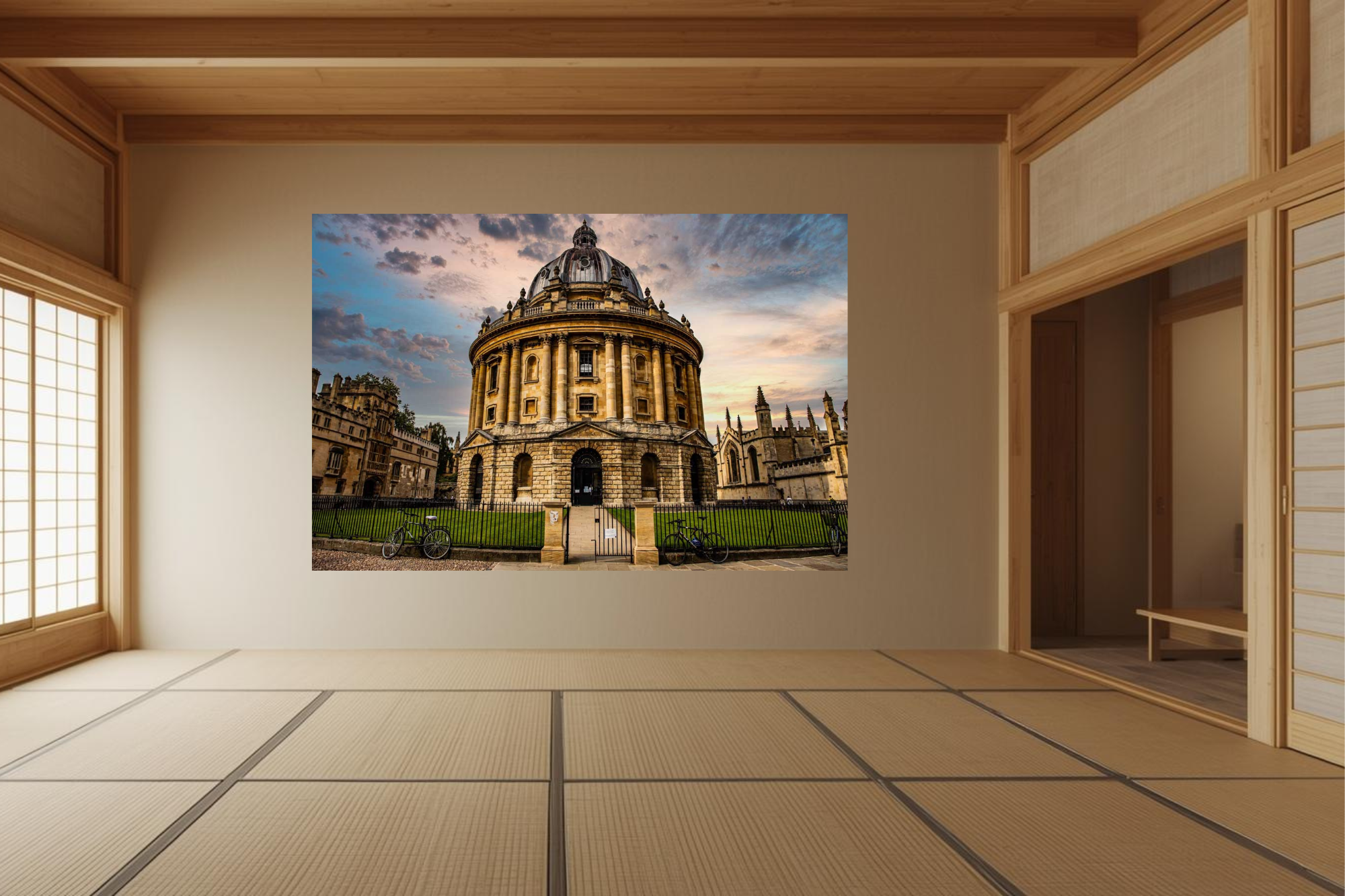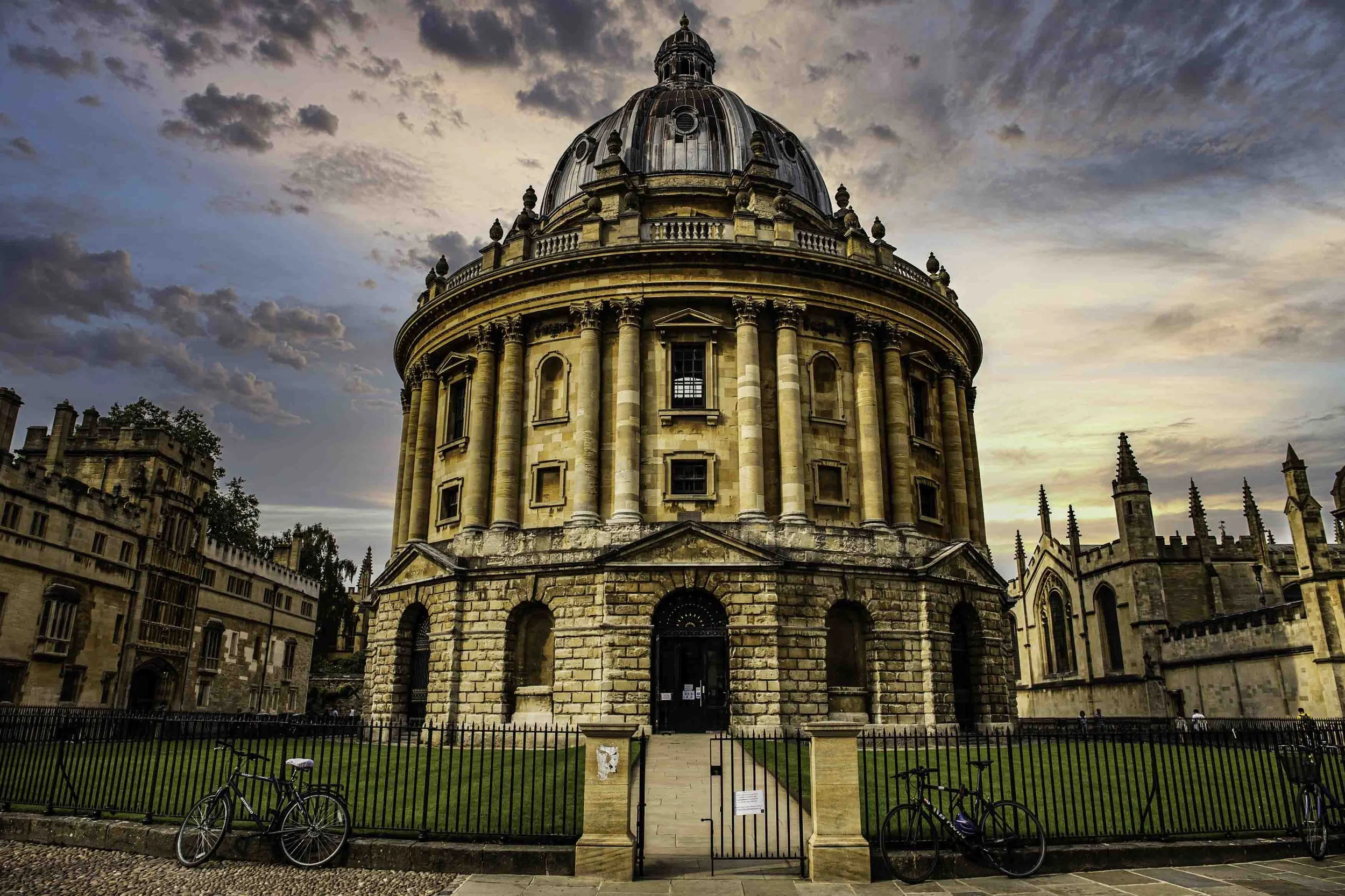 The Oxford library stands proudly beneath a soft pink sunset sky as bicycles rest against the railing, adding character to the historic architecture.