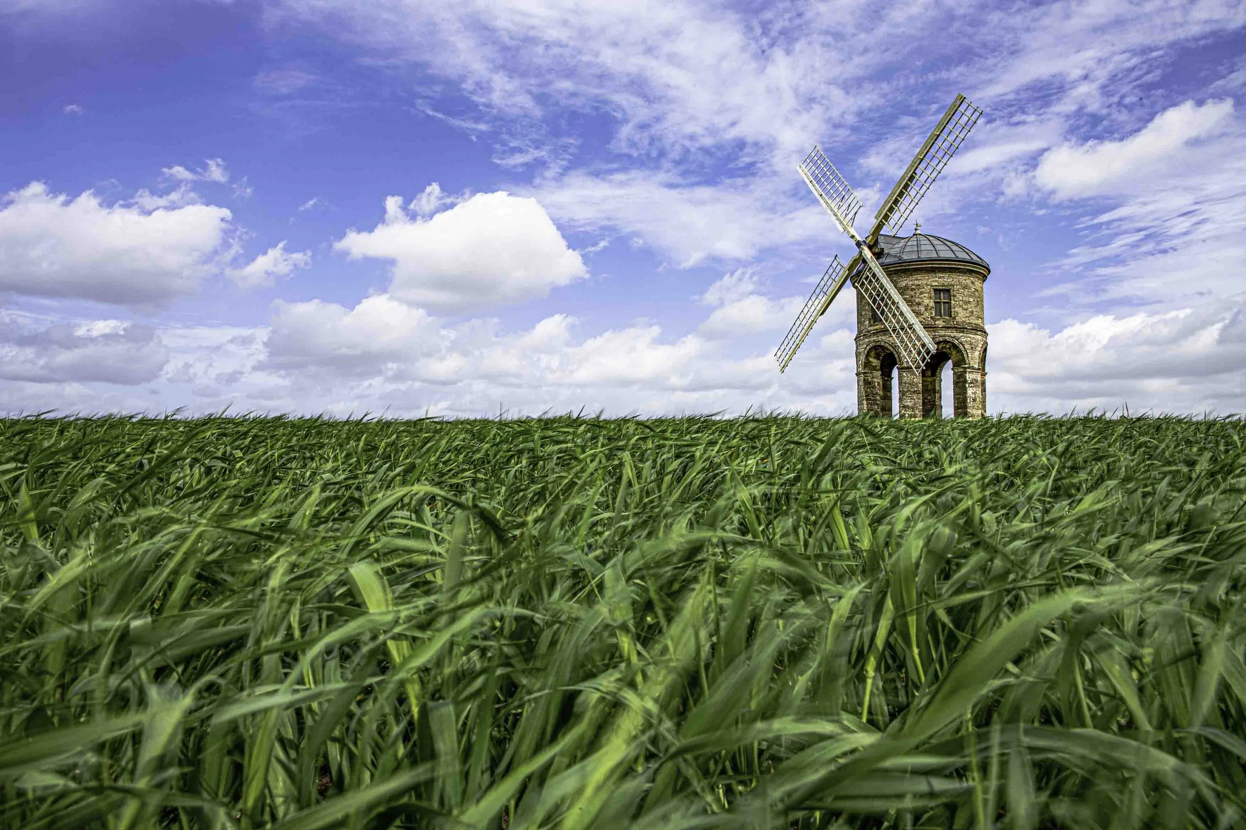Chesterton Windmill stands beneath a sky full of wispy white clouds, drifting lightly across the blue expanse.