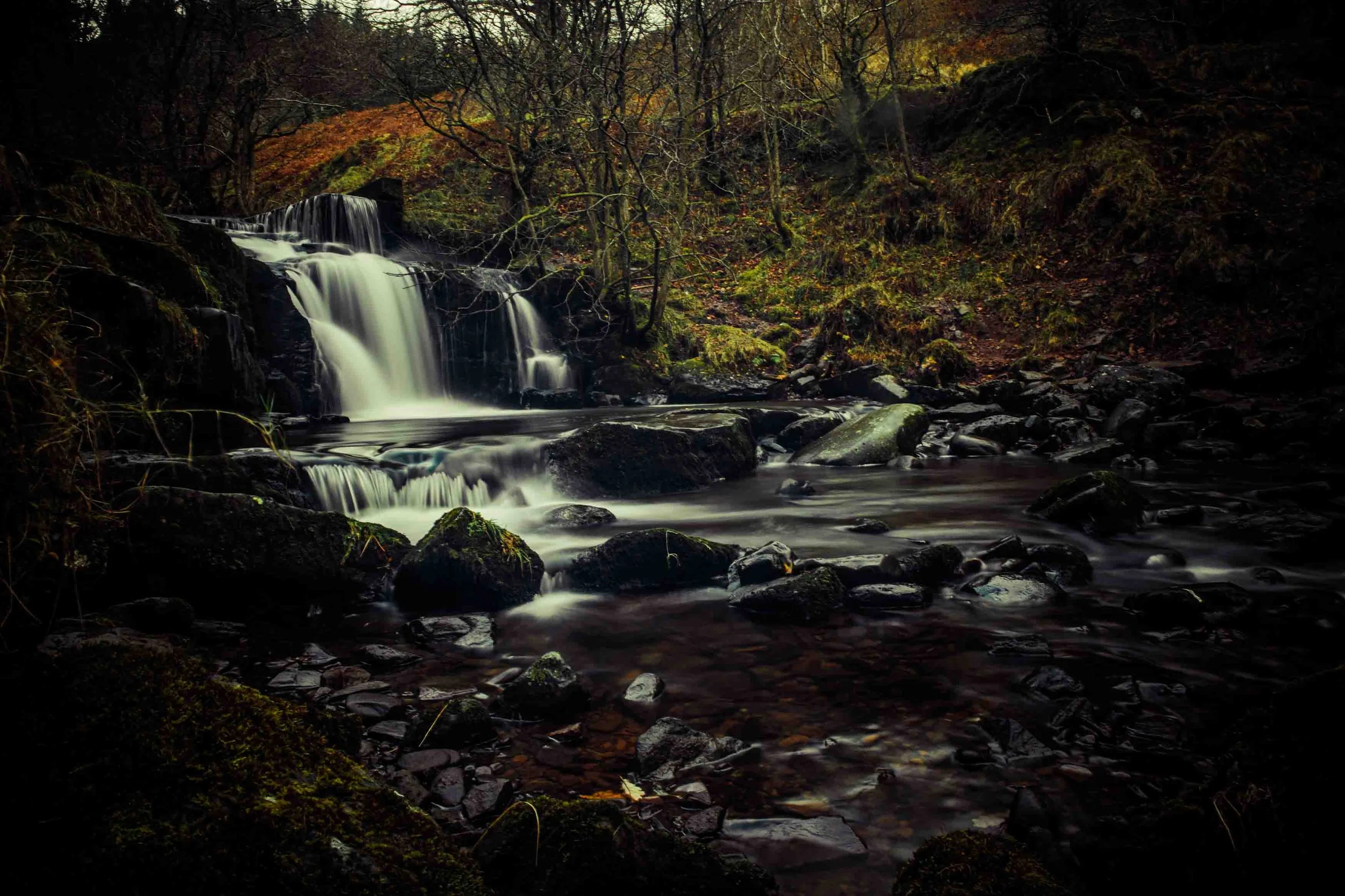 A gentle waterfall cascades through an autumn forest where deep greens mix with the warmth of autumn oranges.