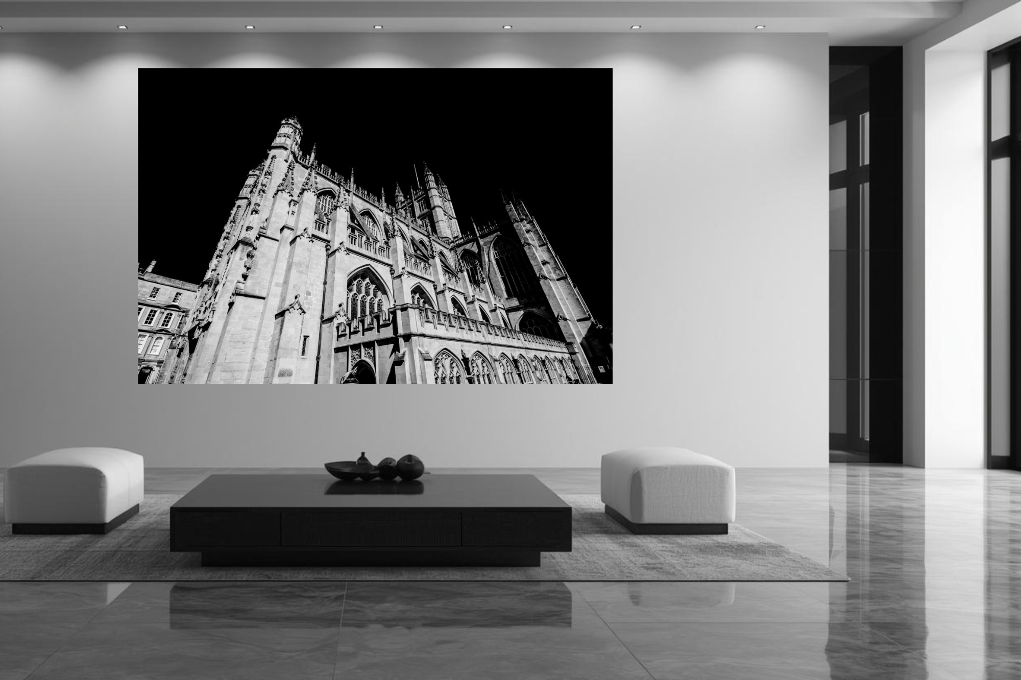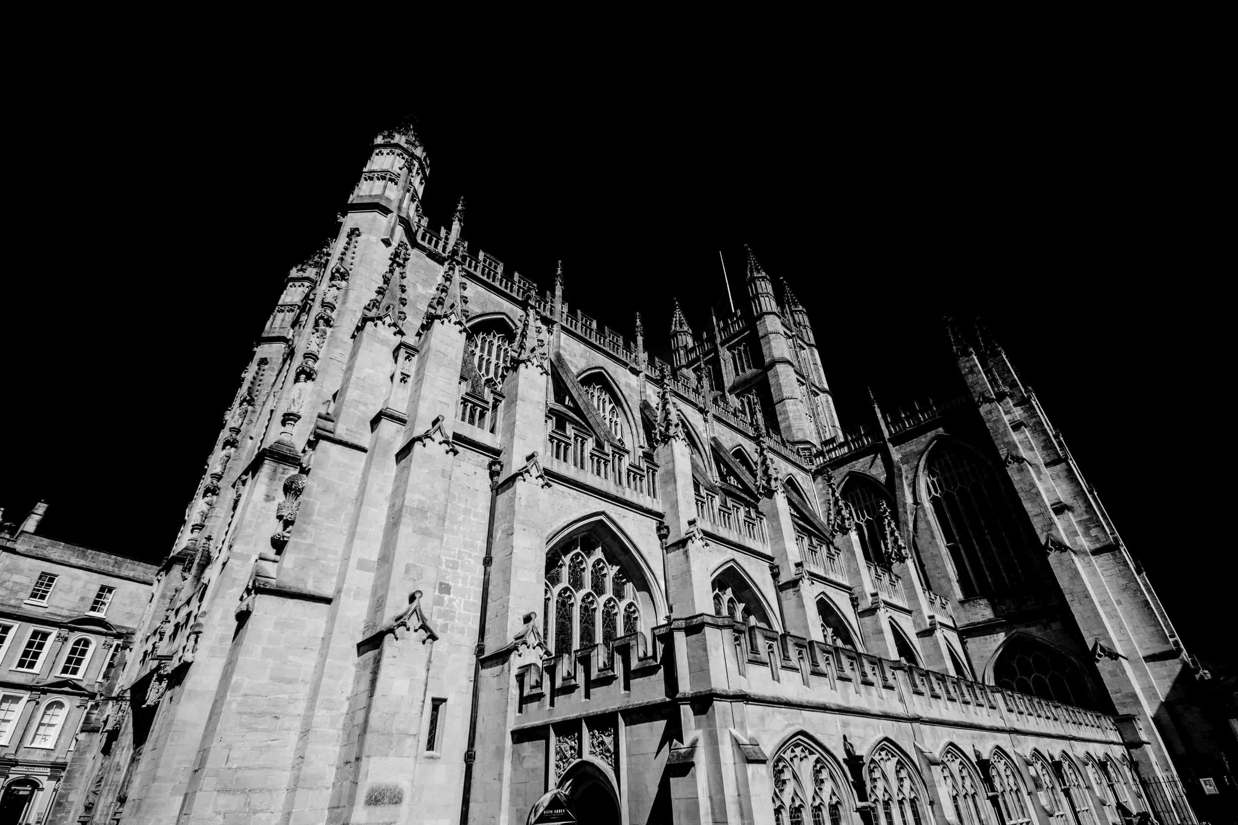 Bath Abbey stands starkly against the night sky, its stonework illuminated in sharp monochrome. The balance of light and shadow reveals the magnificently intricate details of the architecture.