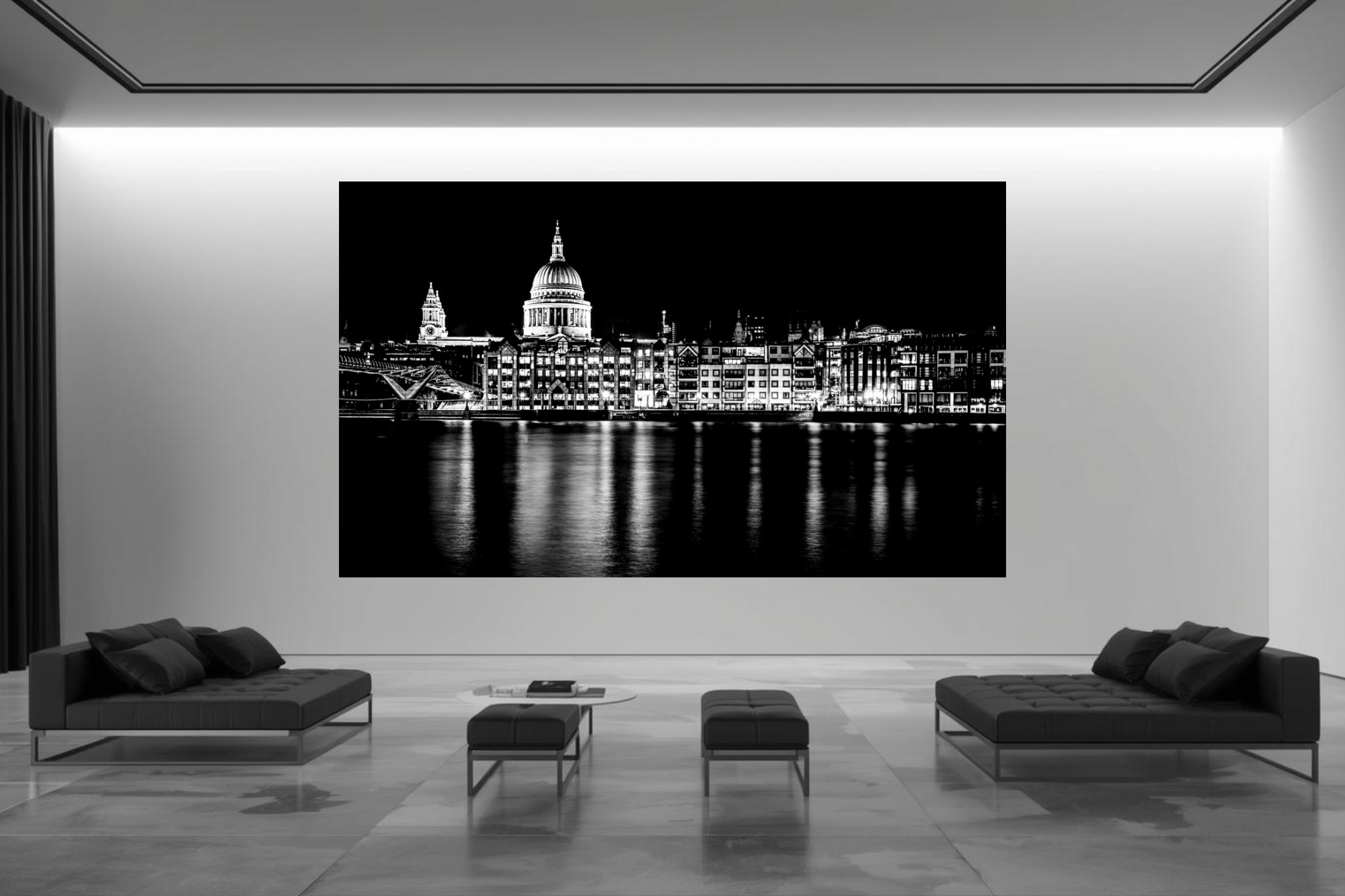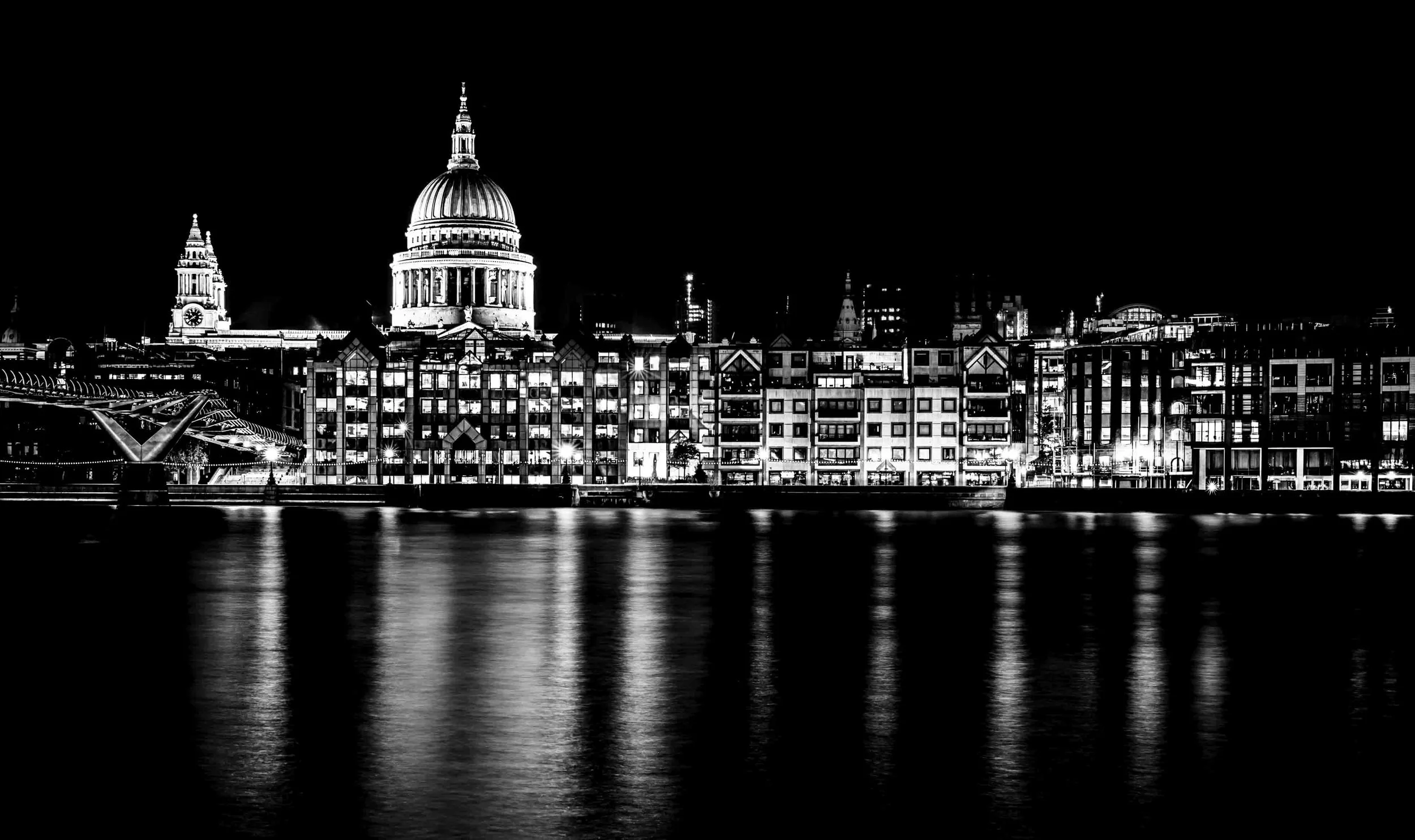 A wider view of St Pauls and the surrounding buildings from the south bank of the Thames. The monochrome palette brings out the bold skyline shapes and the cathedral’s iconic dome.